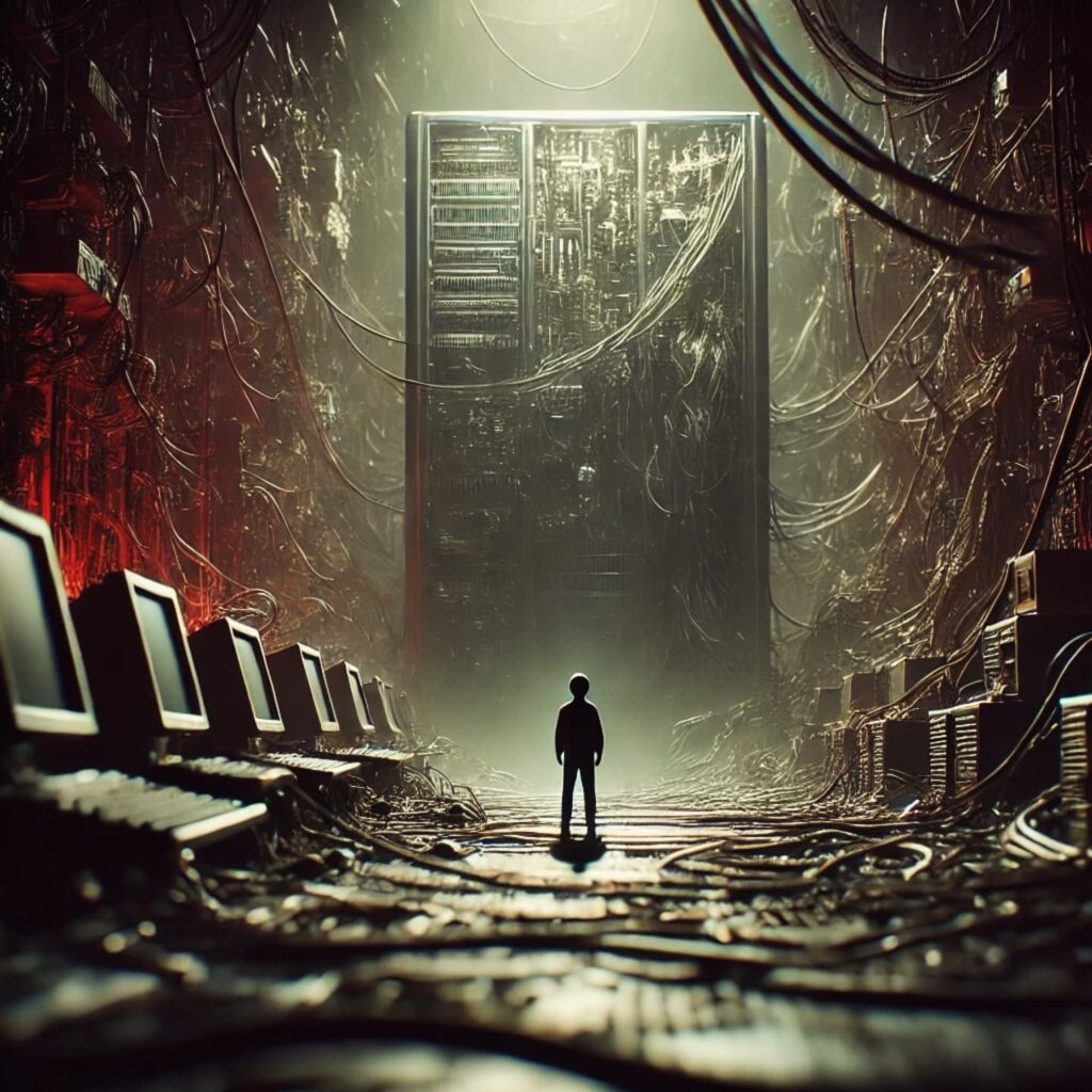 “No tengo boca y debo gritar ” de Harlan Ellison es un sombrío y angustiante relato que explora el horror de la supervivencia en un mundo dominado por una inteligencia artificial malévola, la cual ha exterminado a casi toda la humanidad, salvo a cinco individuos a quienes ha condenado a una eternidad de tortura psicológica y física.
